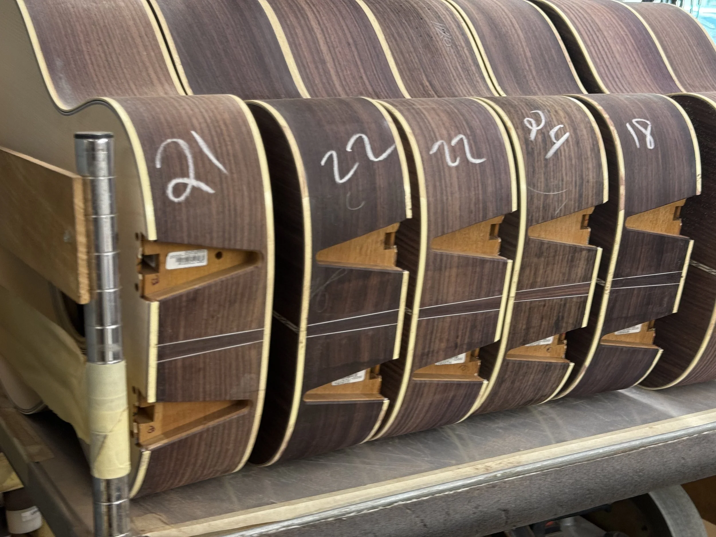 The wood veneers are heated to shape the sides of the guitar, then a flexible ribbon of wood is glued to the edges for a larger gluing surface for the tops and backs of the guitar.