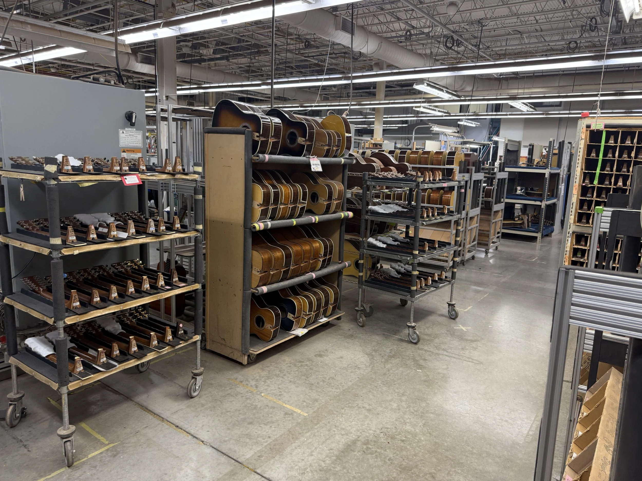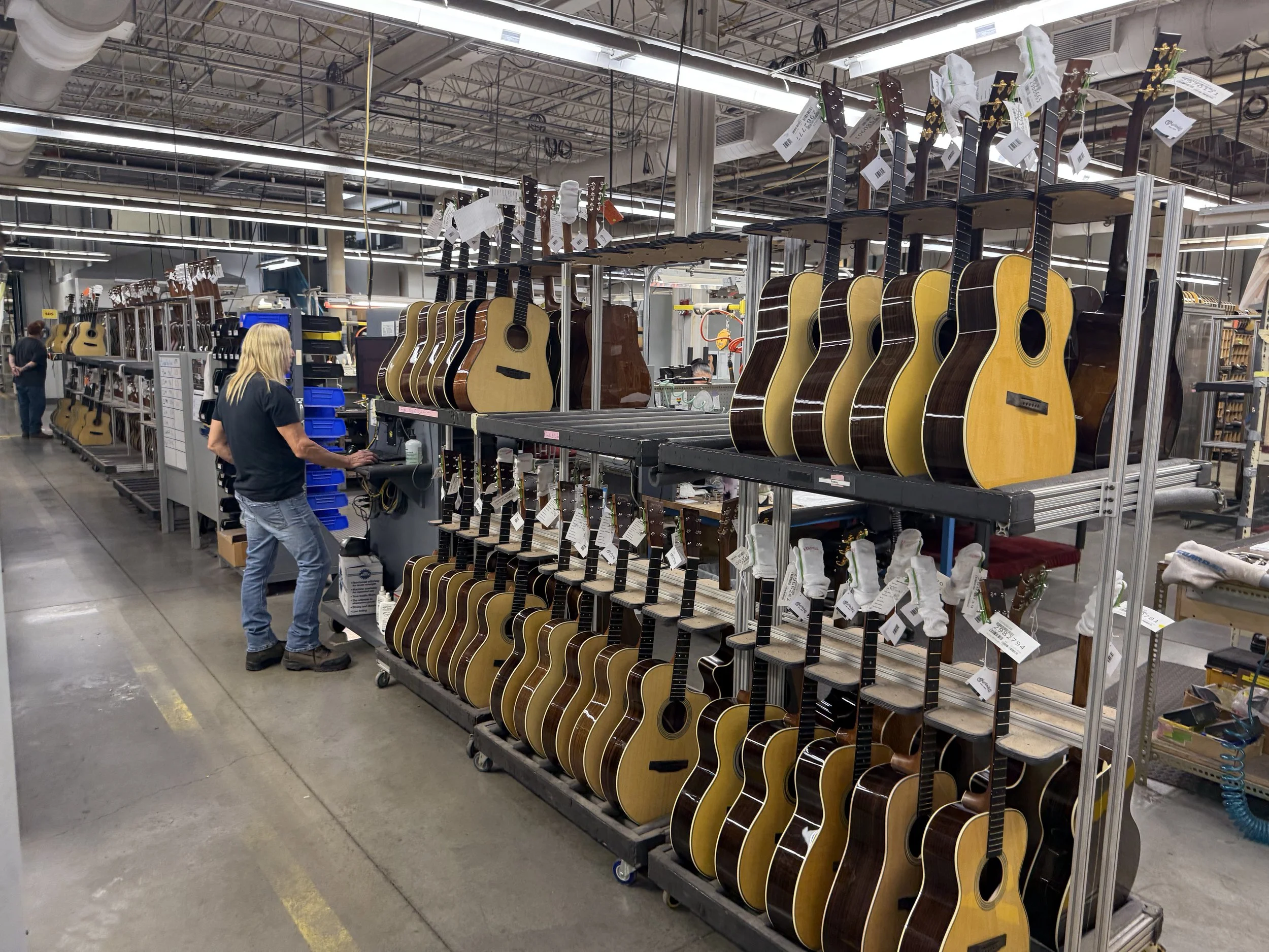 Finished guitars go to quality control where they are strung, tuned, placed in cases for 4 days before being tested to see if they stayed in tune before getting shipped out for sale.