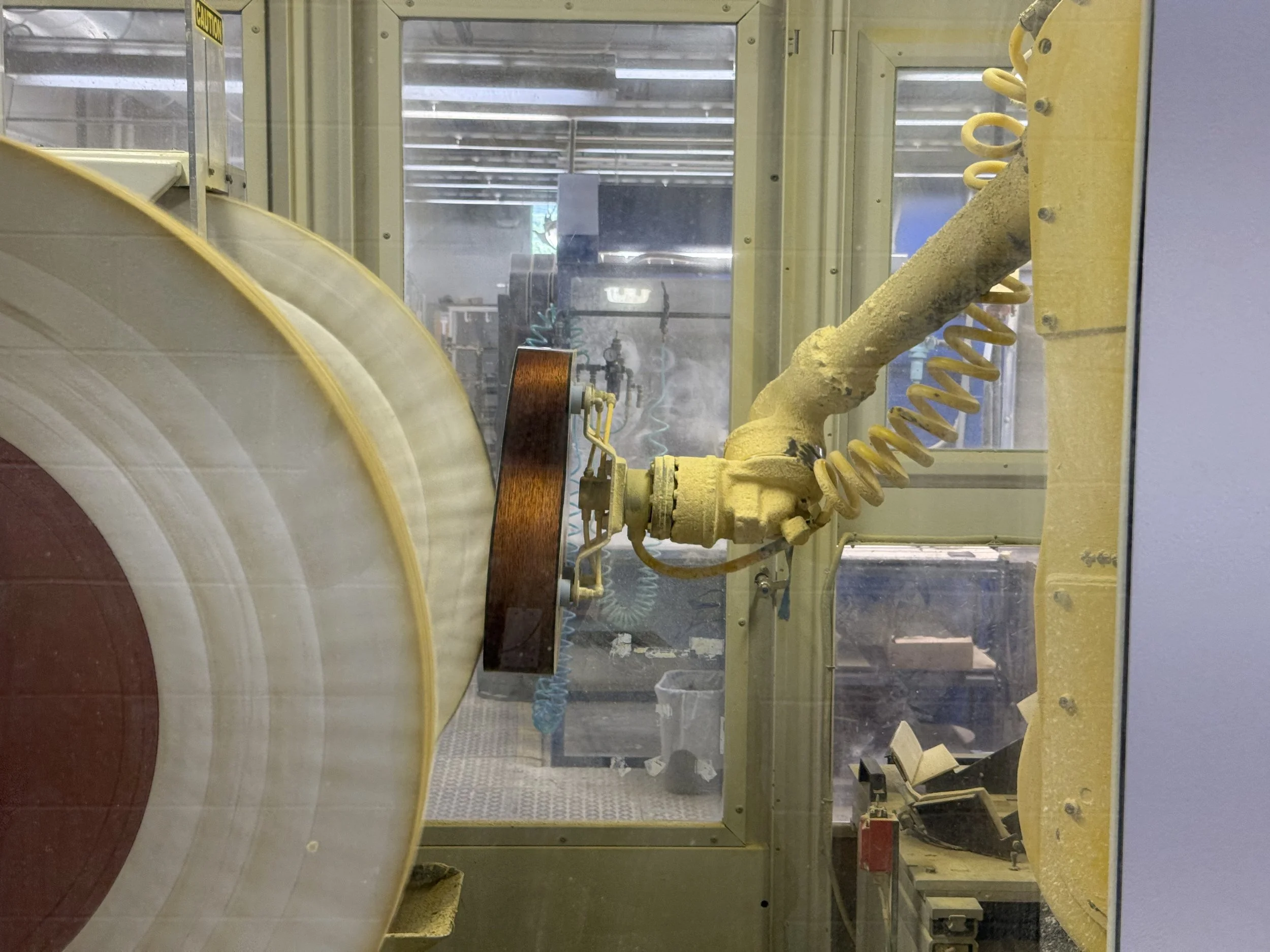 After hand polishing, inspections, & corrections, this robot gives the guitars a final polish.