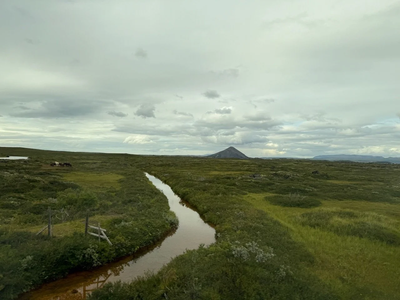 The flat area of this part of Iceland is where the North American and the Eurasian Tectonic plates are diverging causing the island to be pulled apart (about an inch a year). This divergent boundary is also cause for the volcanic and geothermal activity.