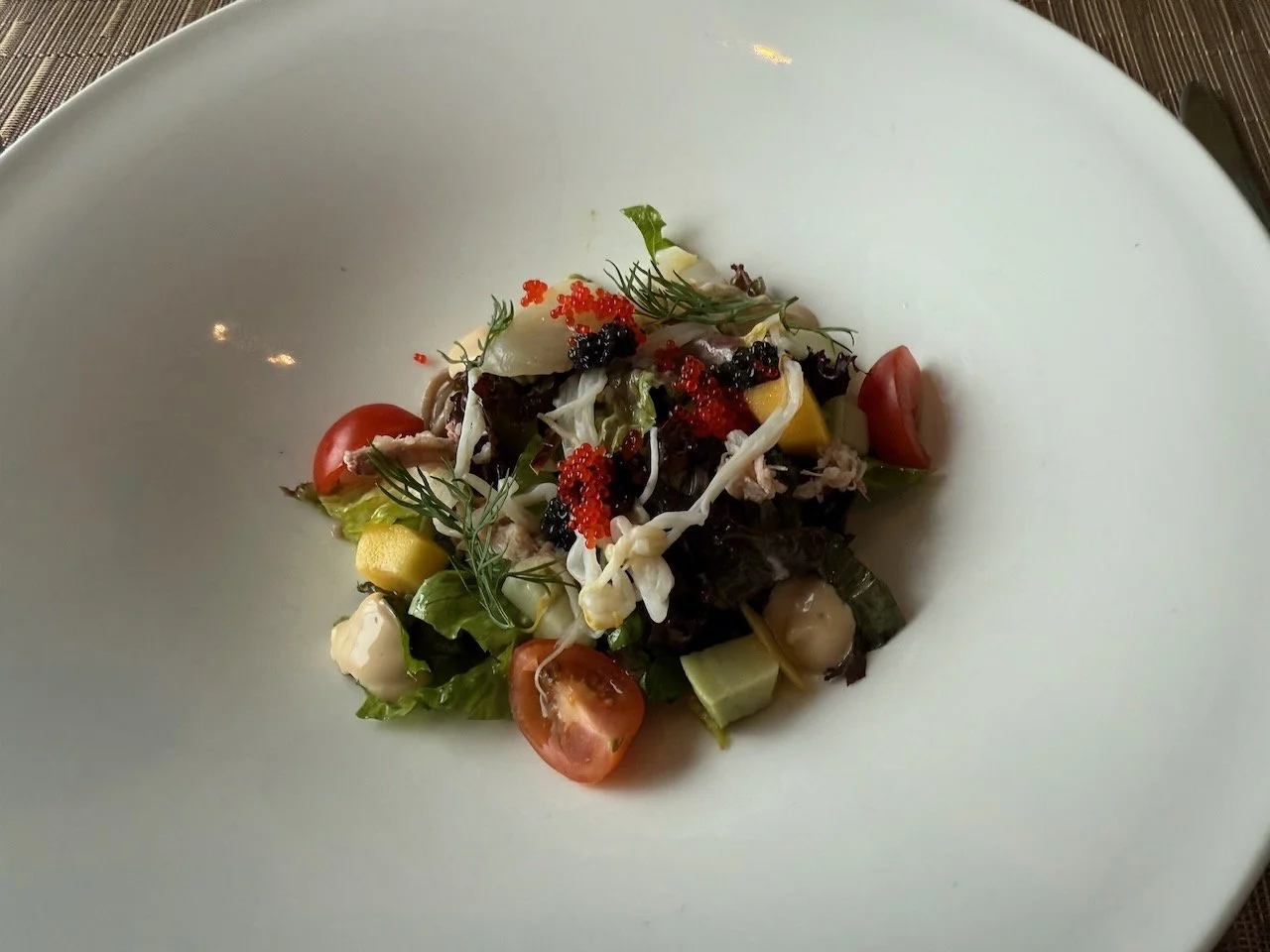 crab meat scallop, tobiko, avocado, cucumber, mango, soba noodle, sesame mayo dressing