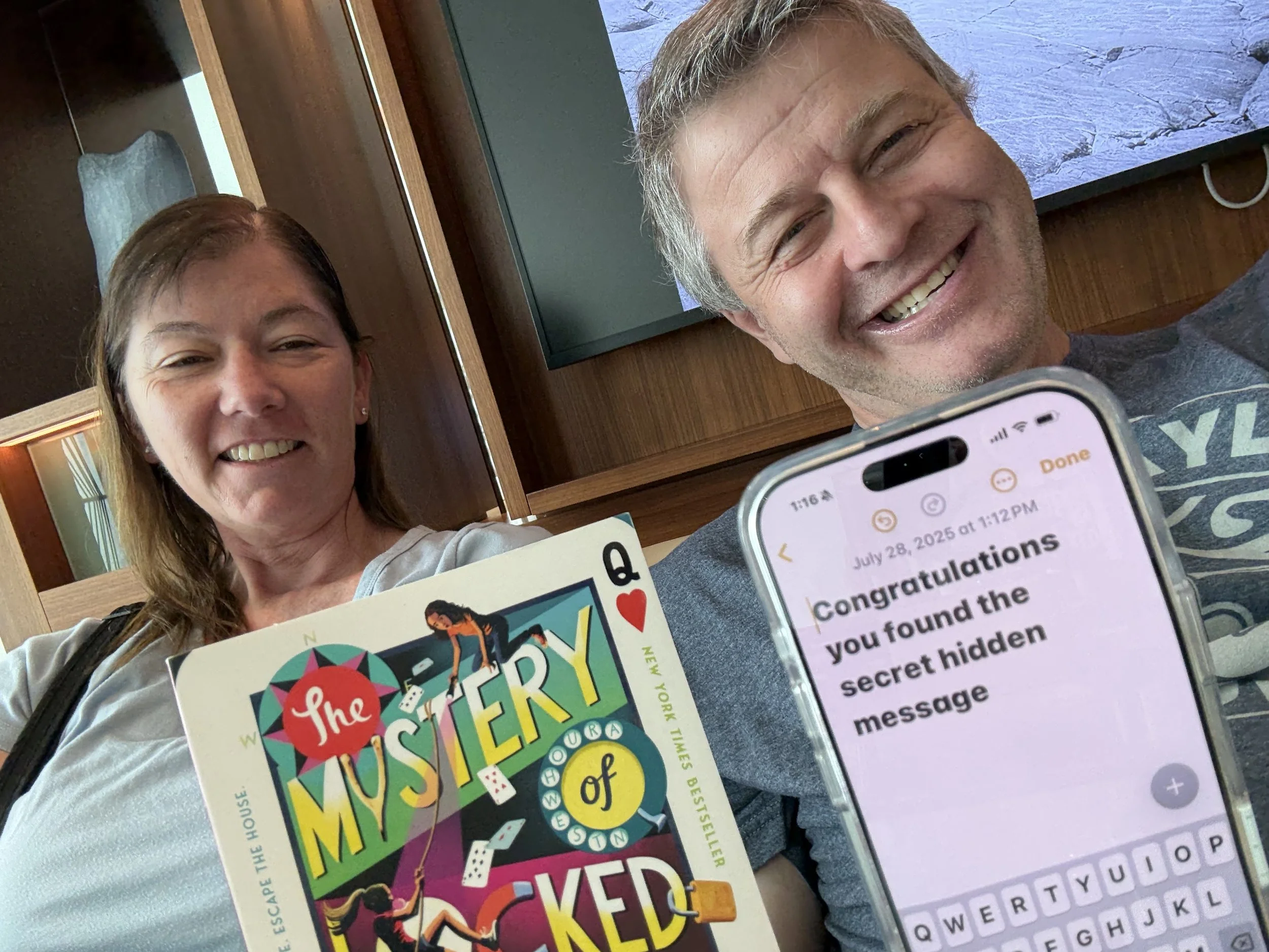 The third clue was a picture of a book titles The Mystery of the Locked Rooms with the message "A mysterious and fun book that I brought, read, and donated awaits you". We found the book in the lending library. Inside he had underlined 7 words that we put in order for the secret message.