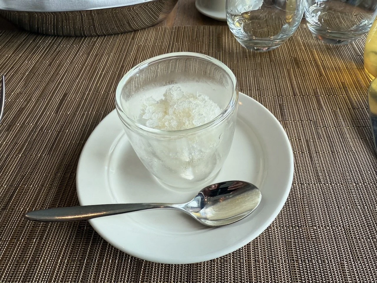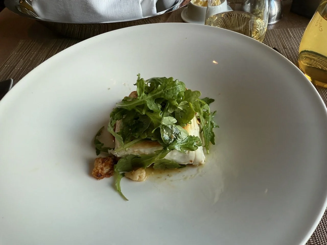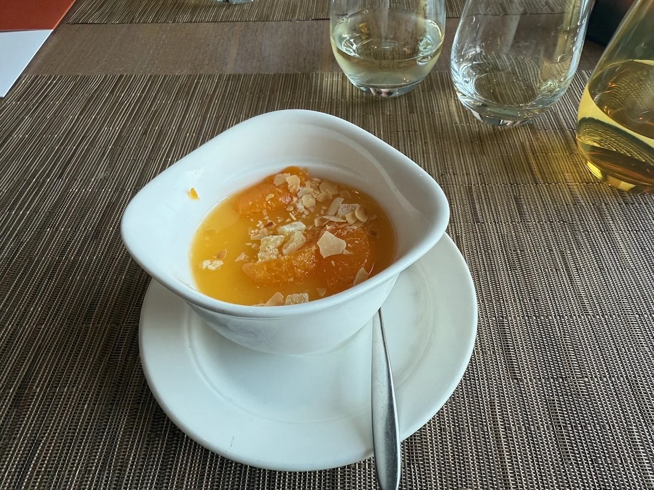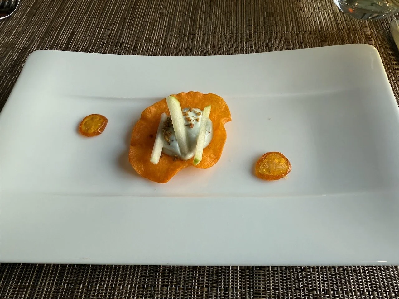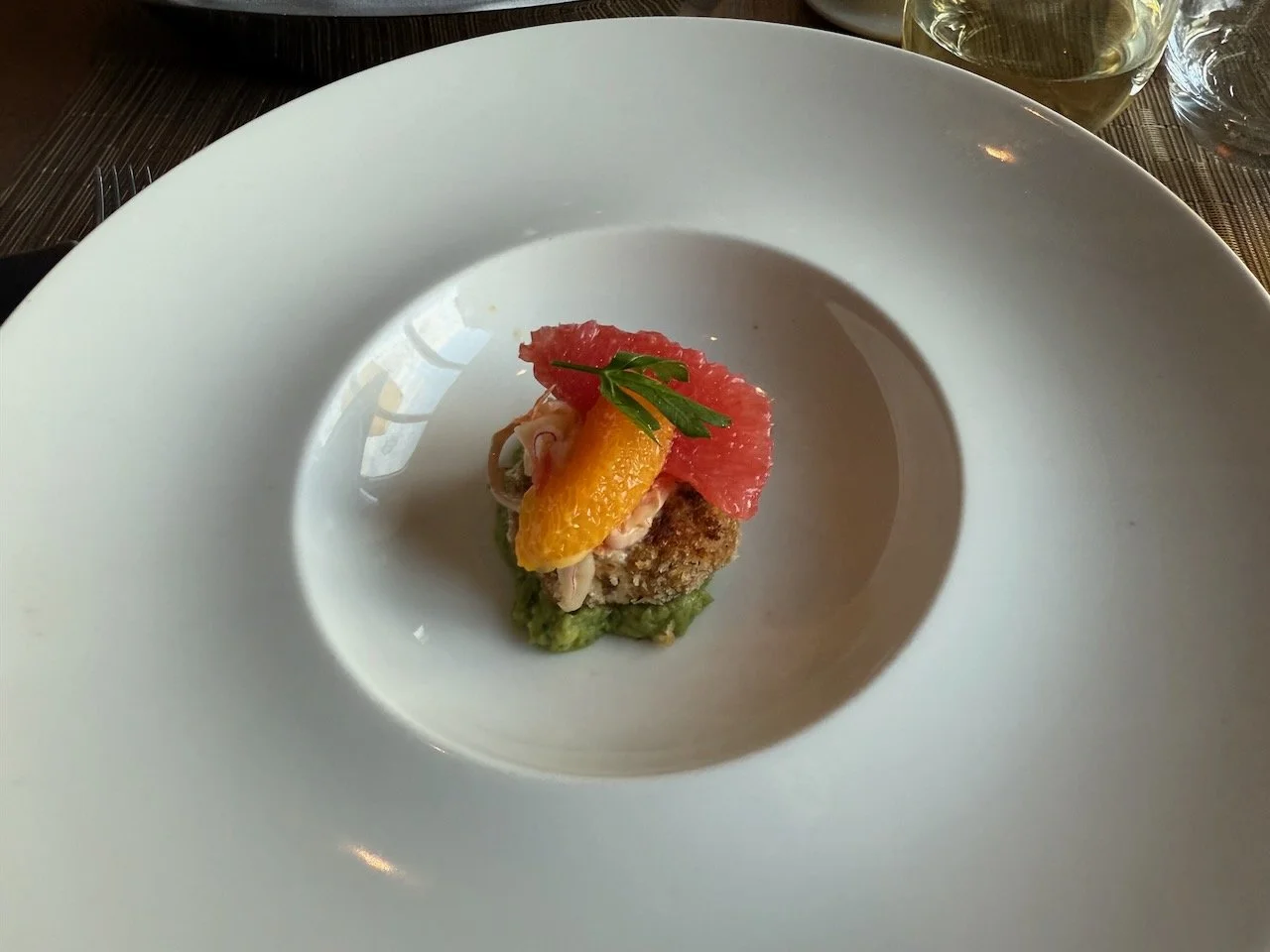 Crab cake with avocado, orange, fennel, shallot, dill and blood orange